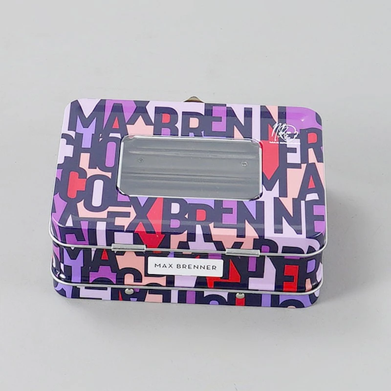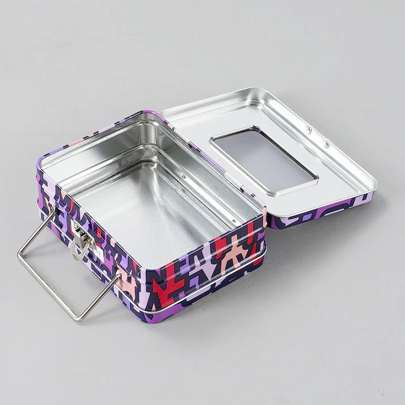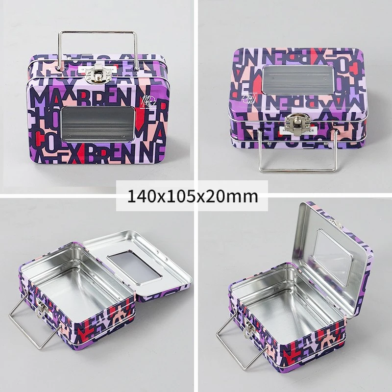 Esta caja de hojalata con ventana rectangular está fabricada con hojalata de 0,23 mm de alta calidad y se produce con unas dimensiones precisas de 140 × 105 × 20 mm. Con una ventana de visualización transparente y un mango de metal resistente, ofrece funcionalidad y presentación visual de primera calidad. La impresión de colores planos CMYK mejora la visibilidad de la marca con gráficos vibrantes y duraderos.